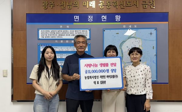 [전남인터넷신문/서성열기자]전라남도 나주시 금천면은 관내 농업회사법인 자연인 바이오팜(주) 김종관 대표가 지난 26일 지역사회 취약계층을 위한 생필품을 기탁했다고 밝혔다.