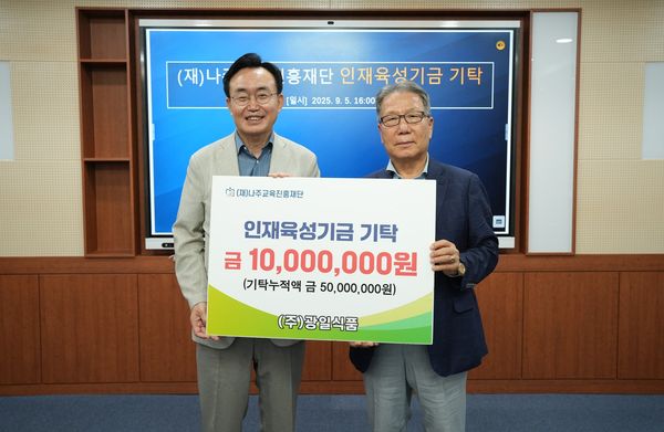 나주시(시장 윤병태)는 ㈜광일식품(대표 조문호)이 인재육성기금 1천만 원을 (재)나주교육진흥재단에 기부하며 2021년부터 지금까지 총 5천만 원의 장학금을 기탁했다고 8일 밝혔다.