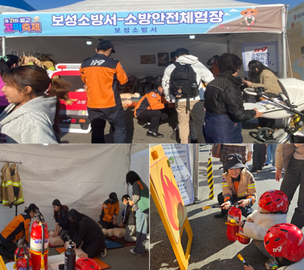 이번 체험장은 축제장을 찾은 방문객들이 직접 참여할 수 있도록 ▲소화기 사용법 실습 ▲심폐소생술(CPR) 교육 ▲방화복 착용체험 ▲소방차 포토존 운영 ▲주택용 소방시설 설치 홍보 ▲전기·주방화재 예방수칙 안내 ▲2025년 소방안전 공모전 수상작 전시 등 체험·홍보 중심의 다양한 프로그램으로 구성됐다.