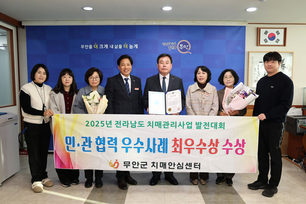 무안군(군수 김산)은 지난 25일 전라남도 주관, 전라남도광역치매센터가 주최한 ‘2025년 치매관리사업 발전대회’에서 치매 예방 및 관리사업의 우수성을 인정받아 최우수기관으로 선정되어 표창을 수상했다.