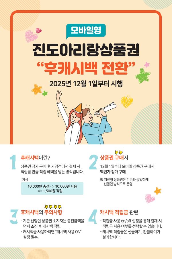 진도군 관계자는 “후캐시백(후적립) 방식은 군민들이 안전하고 편리하게 지역상품권을 사용할 수 있도록 돕는 동시에, 지역 경제에도 힘이 되는 제도다”라며, “앞으로도 군민들이 불편함 없이 혜택을 누릴 수 있도록 안내와 홍보를 강화하겠다”라고 말했다.