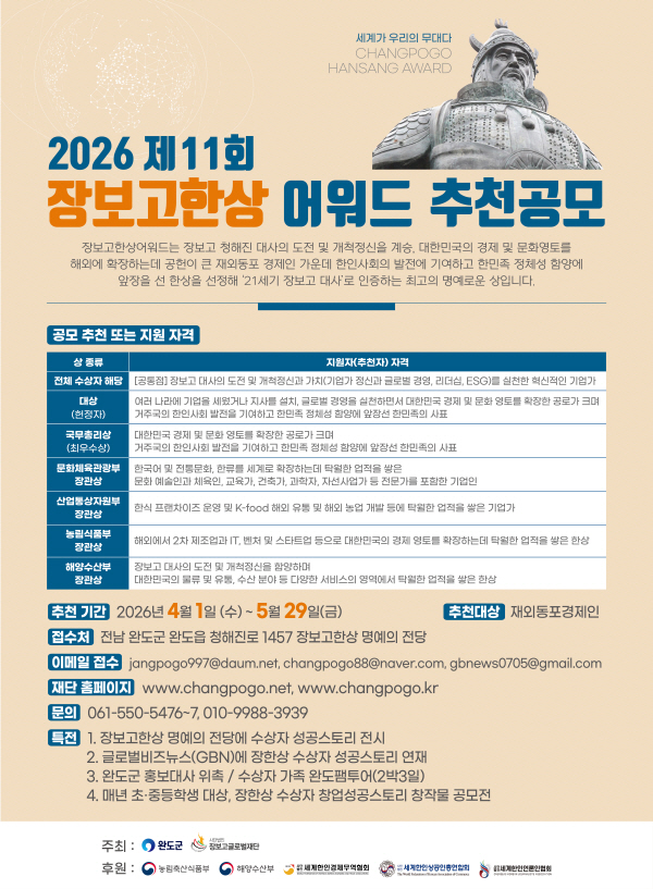 제11회 장보고 한상 어워드 공모전 안내 포스터[전남인터넷신문/강성금 기자]전남 완도군과 장보고글로벌재단이 글로벌 한상 발굴을 위한 ‘장보고 한상 어워드’ 공모에 나섰다.