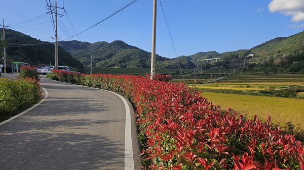 [전남인터넷신문]4일 보성군 벌교읍 외추마을에 ‘청정전남 으뜸마을 만들기’ 사업으로 피어난 붉은 새잎과 벼가 어우러져 가을 정취를 풍기고 있다.