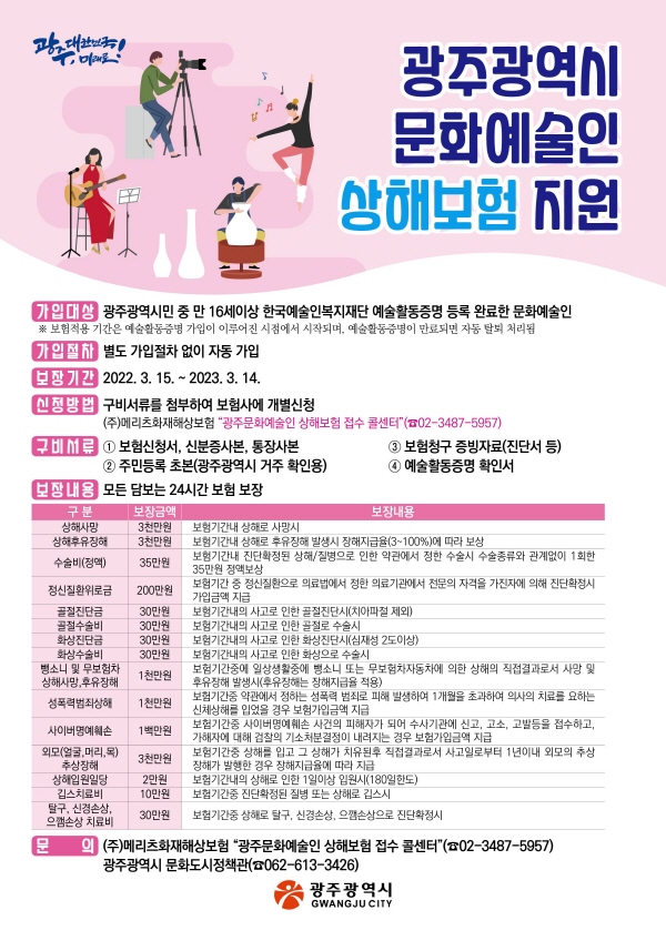 보험가입 기간은 2022년 3월15일부터 2023년 3월14일 자정까지 1년이며, 가입대상은 한국예술인복지재단에 예술활동증명등록을 완료한 만 16세 이상 광주시민으로 별도 절차 없이 자동 가입된다.