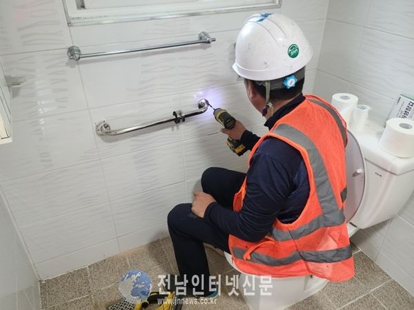 화장실 낙상방지 안전손잡이 설치 광경