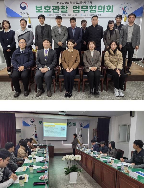 [전남인터넷신문]법무부(장관 정성호) 정읍보호관찰소(신혜진 소장)는 11월 19일 정영하 전주지방법원정읍지원 지원장 등 판사 및 직원, 사회봉사협력기관 등 총 9명을 초청하여 보호관찰 업무협의회를 가졌다