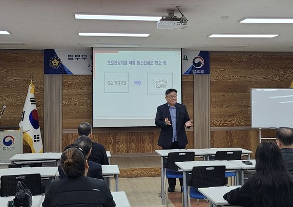 전문화 교육 강의 중인 이충구 소장 [전남인터넷신문]법무부(장관 정성호) 논산보호관찰소는 이달 20일 오후 논산보호관찰소 강당에서 논산보호관찰소협의회 보호관찰위원 14명을 대상으로 전문화 교육을 진행했다고 밝혔다.