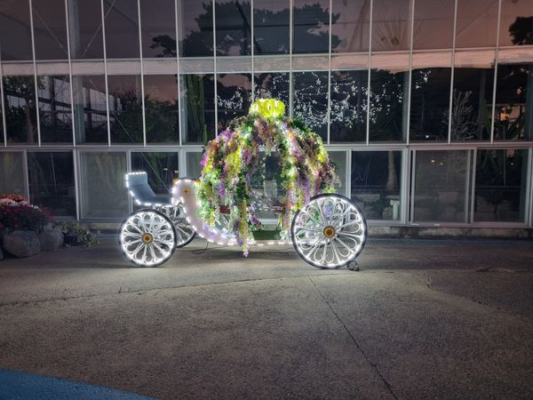 호박마차 포토존은 빛의 띠와 화려한 조화가 어우러져 동화 속 장면을 그대로 옮겨놓은 듯한 환상적인 공간을 연출한다.